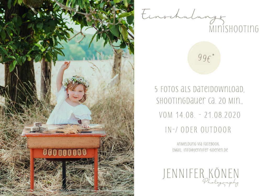 Meine diesjährige Aktion zur Einschulung findet vom 14.08.2020 bis zum 21.08.2020 bei gutem Wetter draußen in Mülheim an der Ruhr statt.